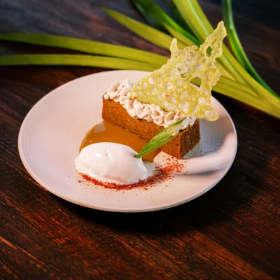 Pandan sponge cake infused with fragrant tropical pandan leaf, served with creamy oconut ice cream — light, aromatic, and gently sweet with a hint of vanilla‑like green notes.
